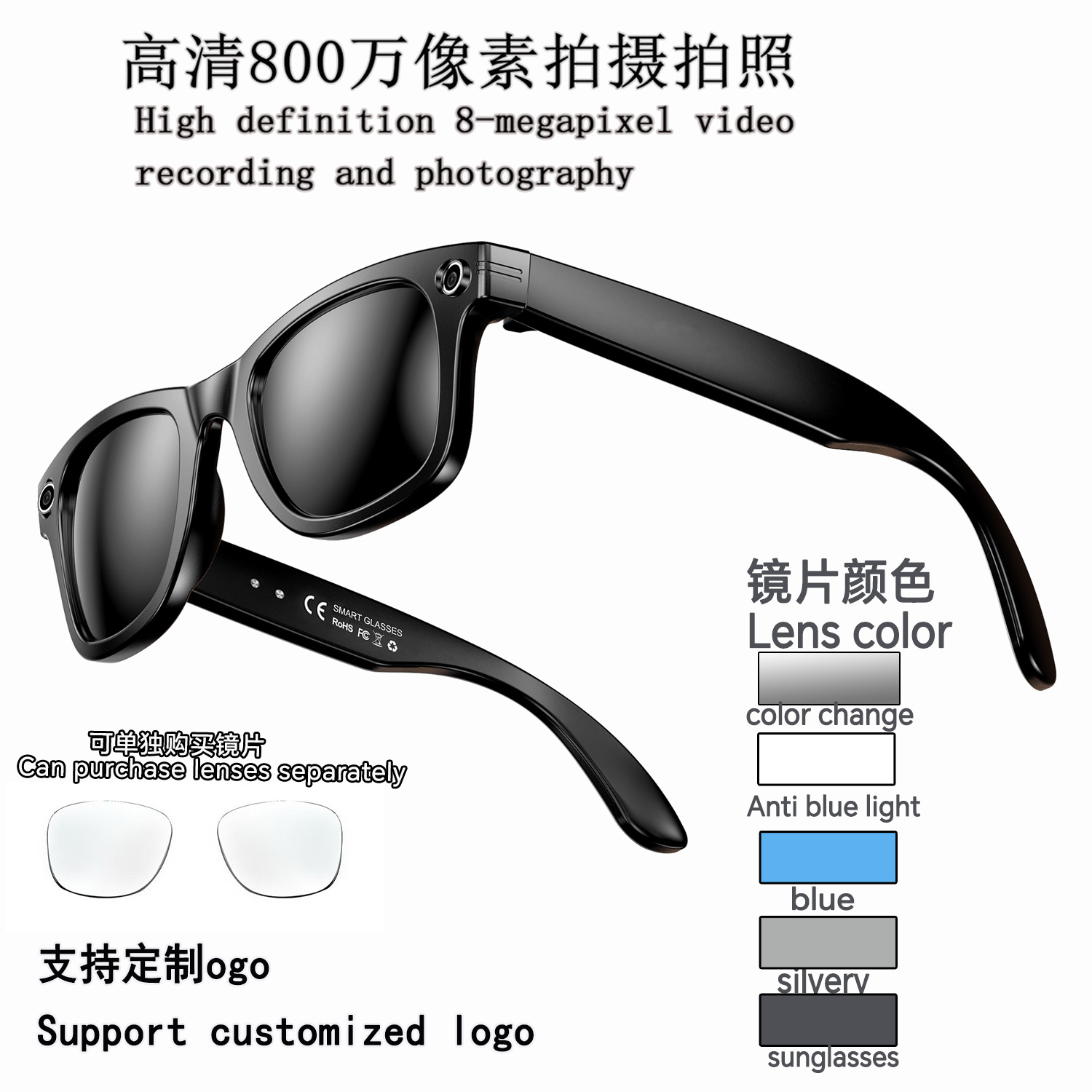HD 800W Memotret Kacamata Cerdas Dengan Kamera AI Terjemahan Kamera Video Kamera Anti Goyang