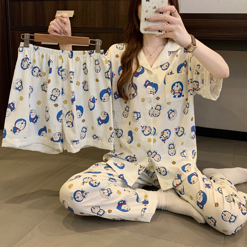 Pakaian Rumah Tangga Gadis Kasual Sederhana Pakaian Tidur Katun Doraemon Yunduo Musim Panas Wanita Set Tiga Potong Bisa Dipakai Luar Grosir