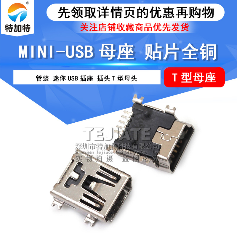 Miniusb soket wanita 5p Mini USB soket persegi panjang patch USB tipe-t wanita cangkang tembaga tegat