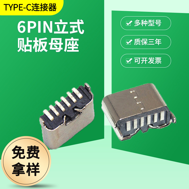 Sumber produsen typec basis perempuan 6pin papan tambalan vertikal arus tinggi pengisian cepat usb soket konektor Terminal