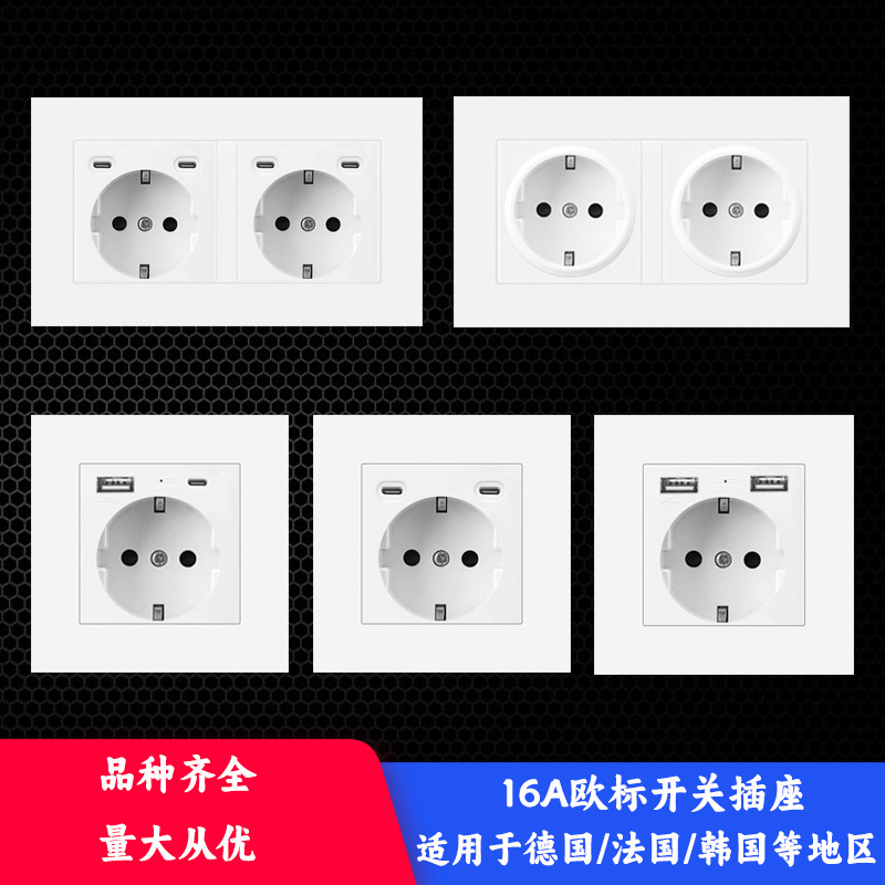 Soket standar Jerman putih soket standar Jerman ganda USB dengan soket standar Eropa Tipe-C panel tersembunyi saklar gaya Eropa 16A standar Eropa