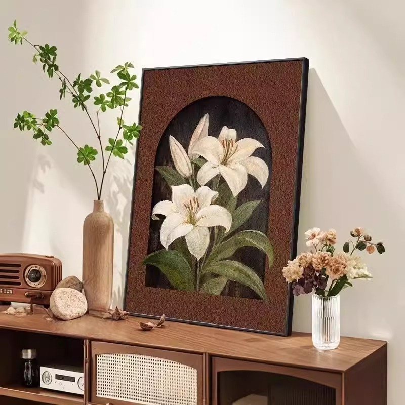 Lukisan Gantung Bunga Lily di Atas Meja Gaya Pertengahan Lukisan Dekorasi Lemari TV Ruang Tamu Retro Prancis Lukisan Mural di Lemari Samping Ruang Makan