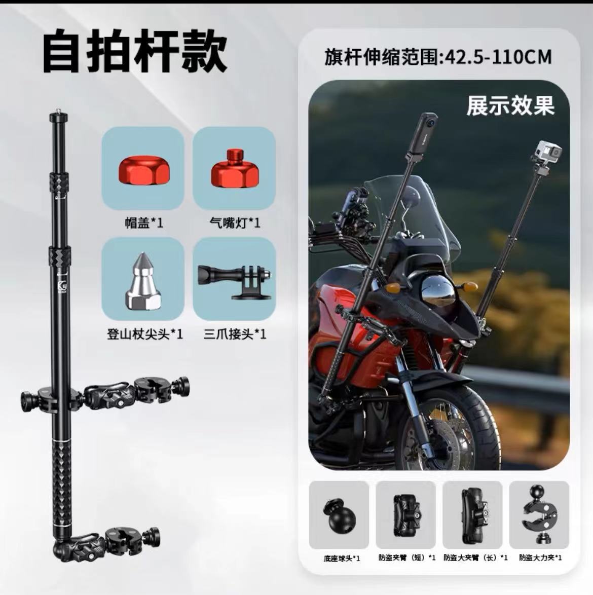 Untuk GoPro13 Dajiang Sepeda Motor Swafoto Tongkat Sepeda Motor Tongkat Penjaga Bilah Perjalanan Tetap Gigi Klip Besar Kepala Ganda