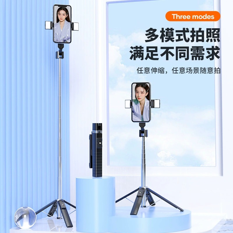 Tongkat selfie alloy 2,2 meter dengan lampu untuk live streaming di luar ruangan, dapat dilengkapi dengan kamera gimbal pintar, dudukan empat kaki, dan lampu pengisi kecantikan.