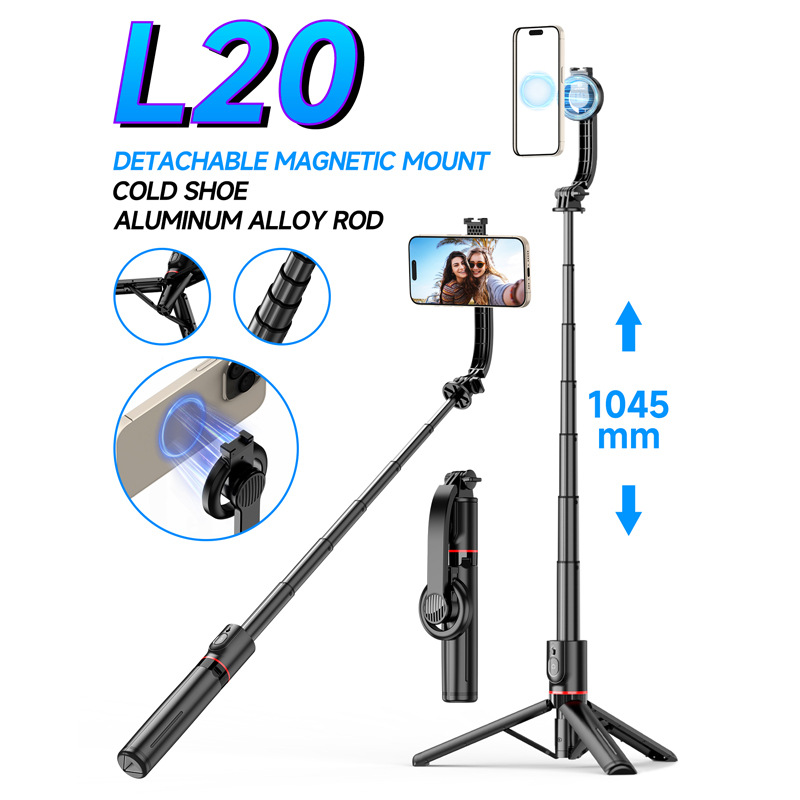 Tongsis Bluetooth Multifungsi Seri L untuk Ponsel, dengan Tripod Penyangga Kokoh, Batang Penstabil, dan Magnetisasi.