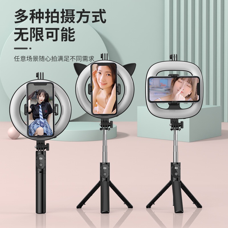 XT02S tongkat swafoto Bluetooth, tongkat selfie ponsel nirkabel dengan braket lampu pengisi, terintegrasi multi-fungsi horizontal dan vertikal
