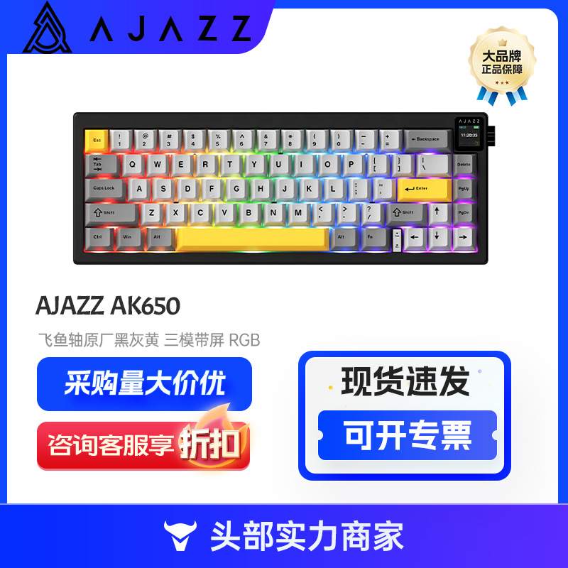 Black Jue AK650 Ikan Terbang Asli Hitam Abu-abu Kuning Tiga Mode dengan Layar RGB Hot Plug Keyboard Mekanik Nirkabel