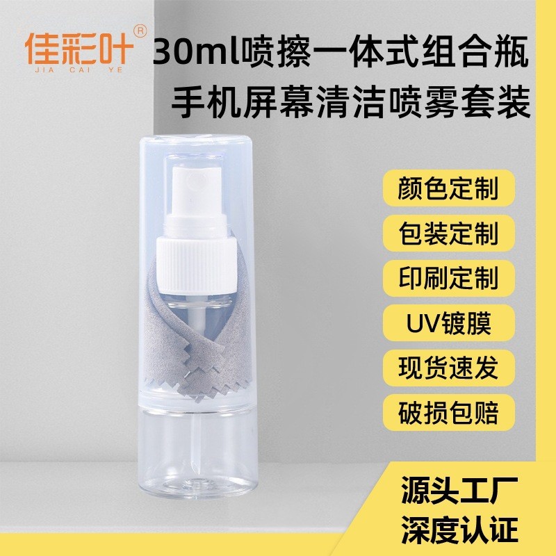 Botol semprot pembersih layar komputer ponsel 30ml, flanel serat dua dalam satu pembersih setelan cetak logo