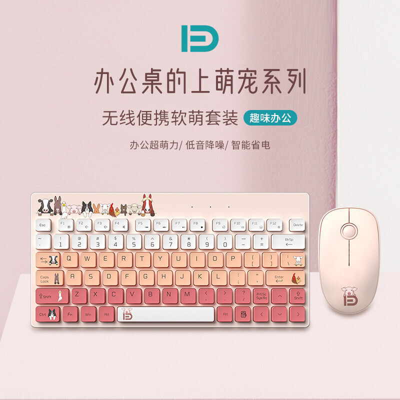 Fude 1501 keyboard nirkabel dan mouse, setelan anak perempuan binatang lucu laptop kantor senyap