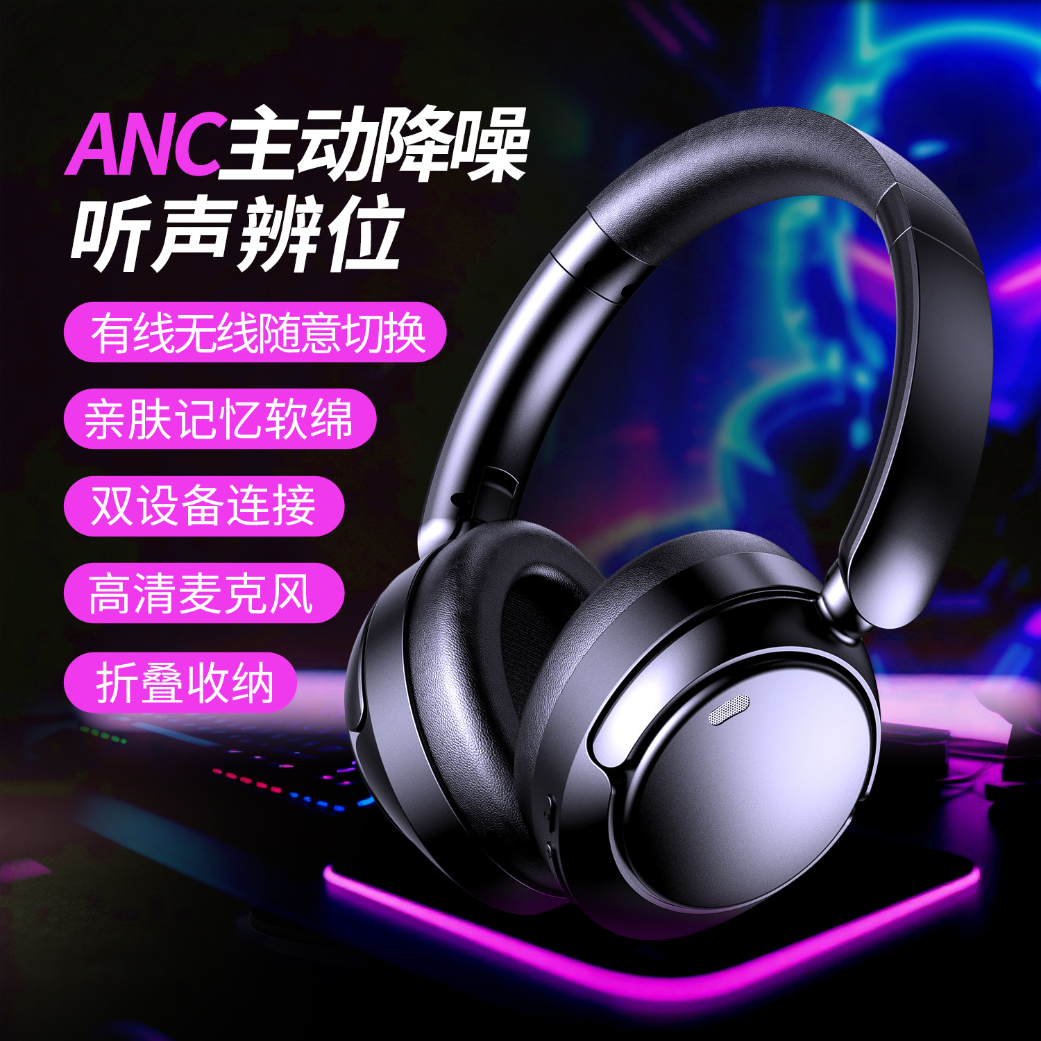 Headset Bluetooth nirkabel, headset Bluetooth nirkabel, dapat dilipat, komputer, ponsel, bass bercahaya, telinga kucing lucu