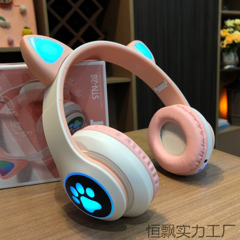 Headset Nirkabel Bluetooth Telinga Kucing Gadis Earphone Headset Bercahaya