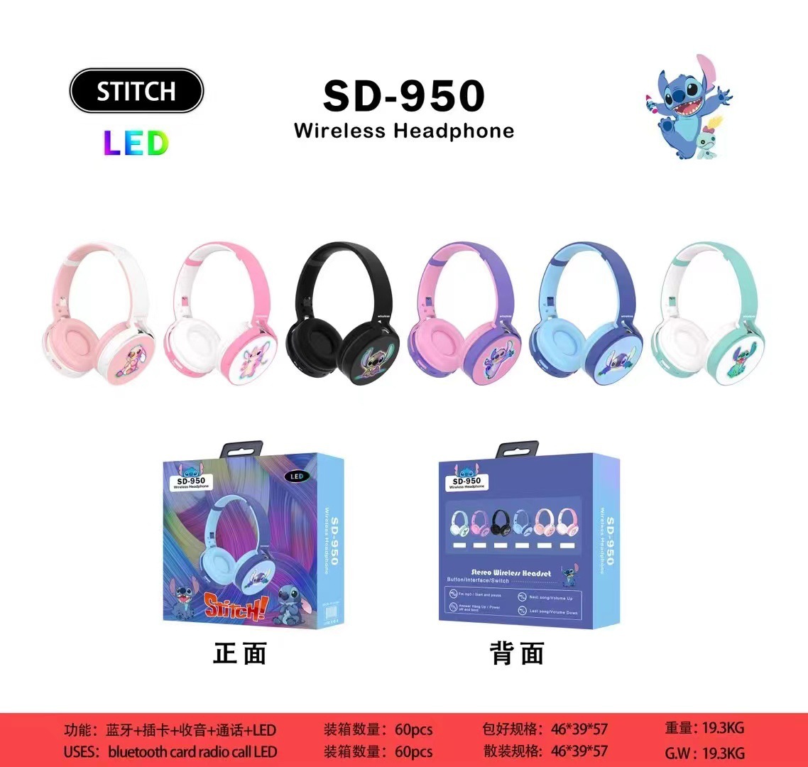 Headset SD-950, Bluetooth nirkabel stereo pola kartun stitch headset bass TF/FM