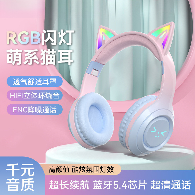 Earphone Bluetooth Pemancar Telinga Kucing Super Siaga Wanita Model Baru Ponsel Pengurangan Noise Bass Olahraga Permainan Kepala