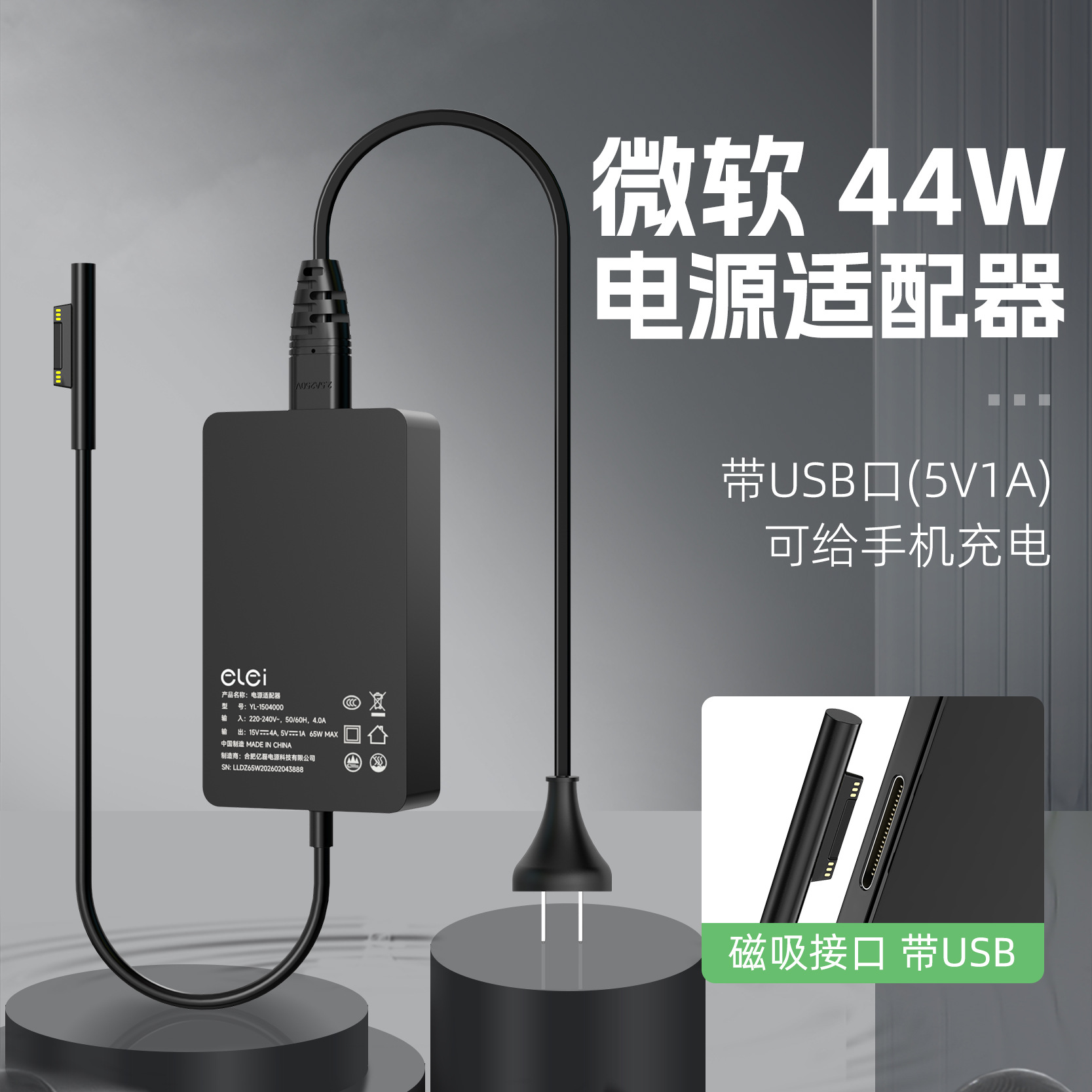 Elei adaptor daya laptop Microsoft 15V2.58A, antarmuka magnetik 44W