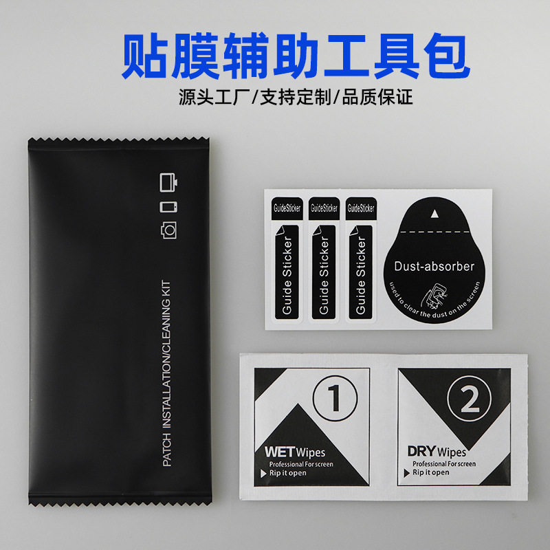 Film ponsel kit tambahan film empat bagian film gel air besar lapisan kaca tempered kartu pembersih tas alkohol grosir