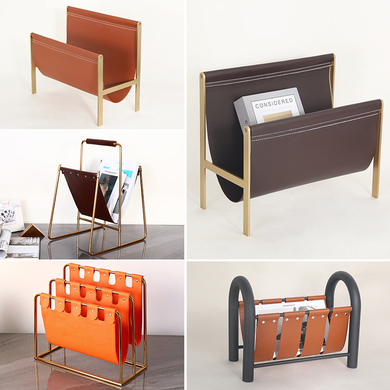 Rak penyimpanan buku sofa, Desktop buku dan koran rak majalah kreatif Nordik sederhana kulit modern logam ruang tamu