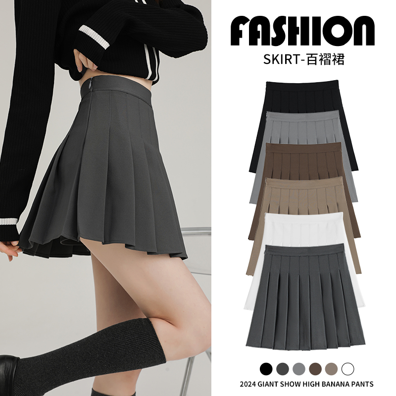 Kualitas Tinggi Rok Lipit Pinggang Tinggi Abu-abu Wanita Musim Gugur Musim Dingin dan Musim Panas 2024 Rok Pendek Terlihat Langsing Model Baru Rok Setengah Badan A-Line JK