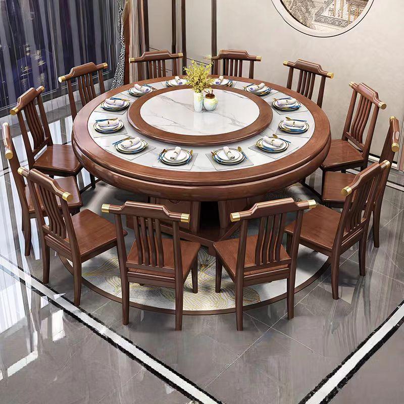 Kursi Meja Makan Papan Batu Kayu Solid Gaya Tiongkok Baru Meja Makan 10 Orang Hotel Meja Bundar Rumah Tangga dengan Meja Berputar