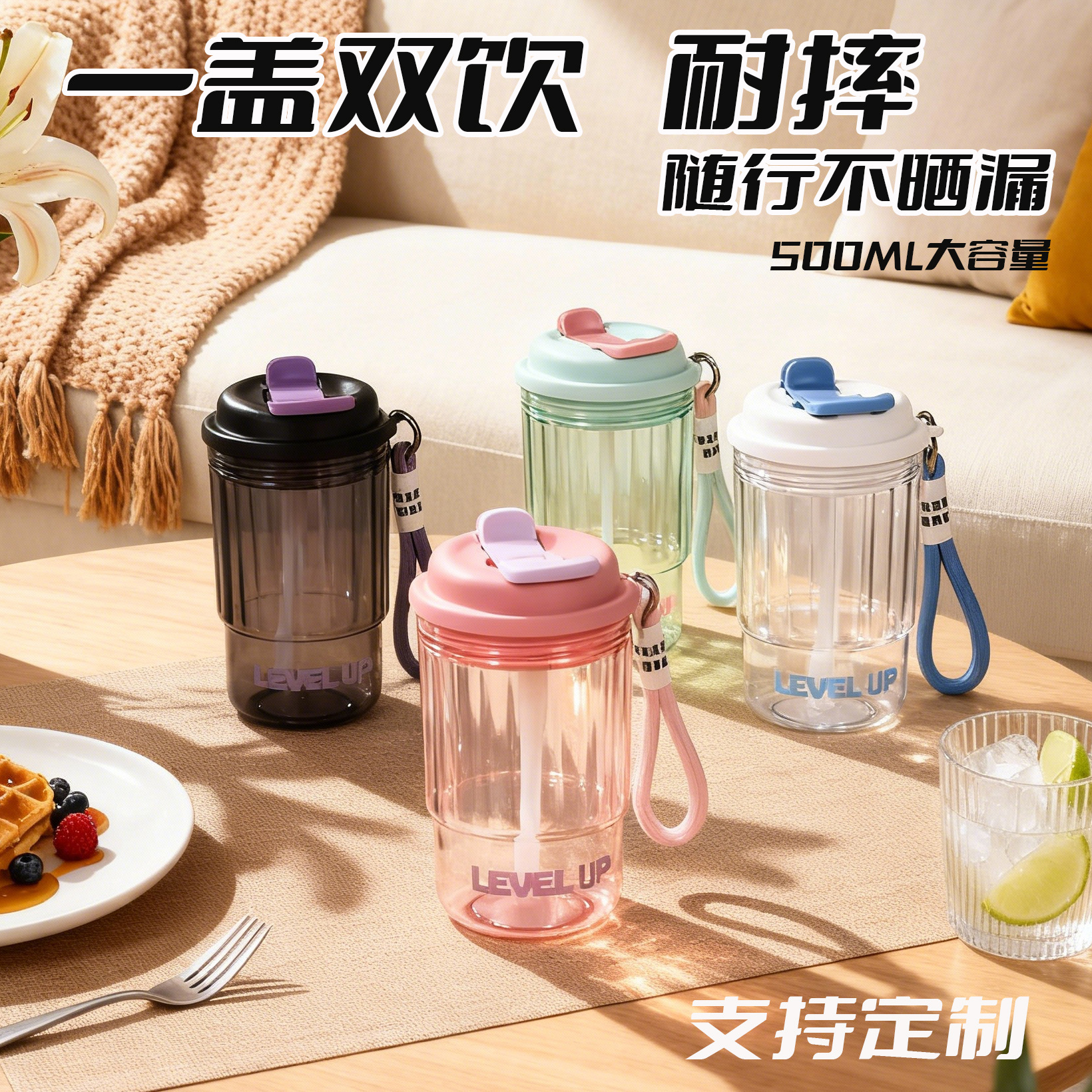 Gelas air, gelas kopi, gelas khusus anak perempuan dengan sedotan, botol minum plastik kapasitas besar untuk pelajar, botol air, botol cola, portabel.