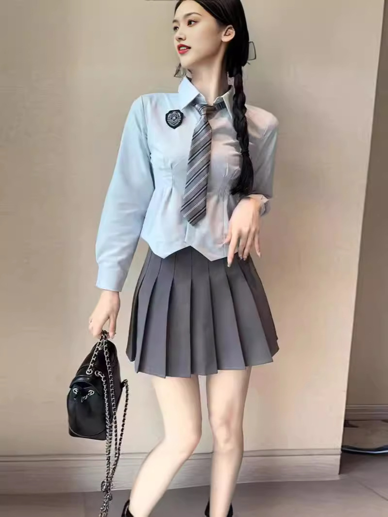 Jk setelan seragam berlengan panjang wanita, kemeja ketat pinggang, Rok lipit serbaguna slim fit pelangsing gaya kuliah Jepang warna putih