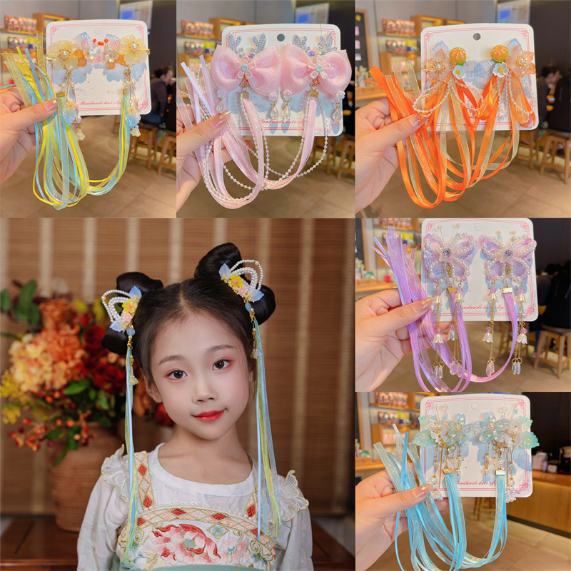 Hanfu hiasan kepala wanita jepit rambut klip pita panjang, jepit rambut Model Tiongkok, kostum kepang rambut kuno rumbai bunga anak perempuan