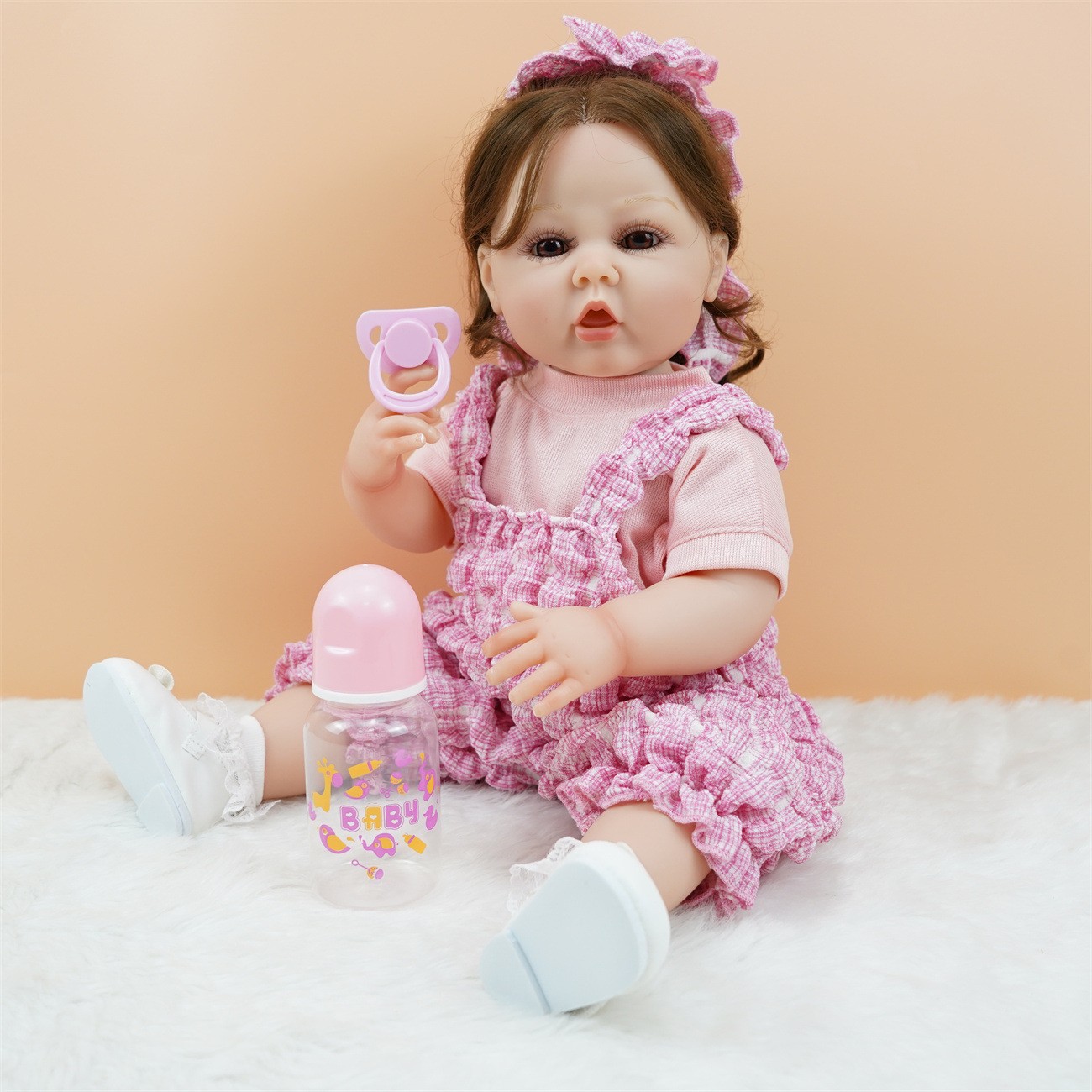 Celana suspender merah muda anak perempuan, celana boneka jari dapat dimakan, mainan bayi simulasi rambut ditanam tangan