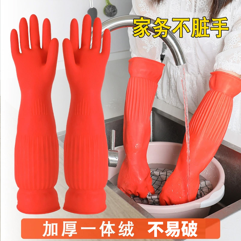 Sarung tangan pencuci piring diperpanjang 45cm musim dingin sarung tangan pekerjaan rumah tangga tahan lama berlapis bulu sarung tangan karet pembersih cucian dapur yang dipertebal