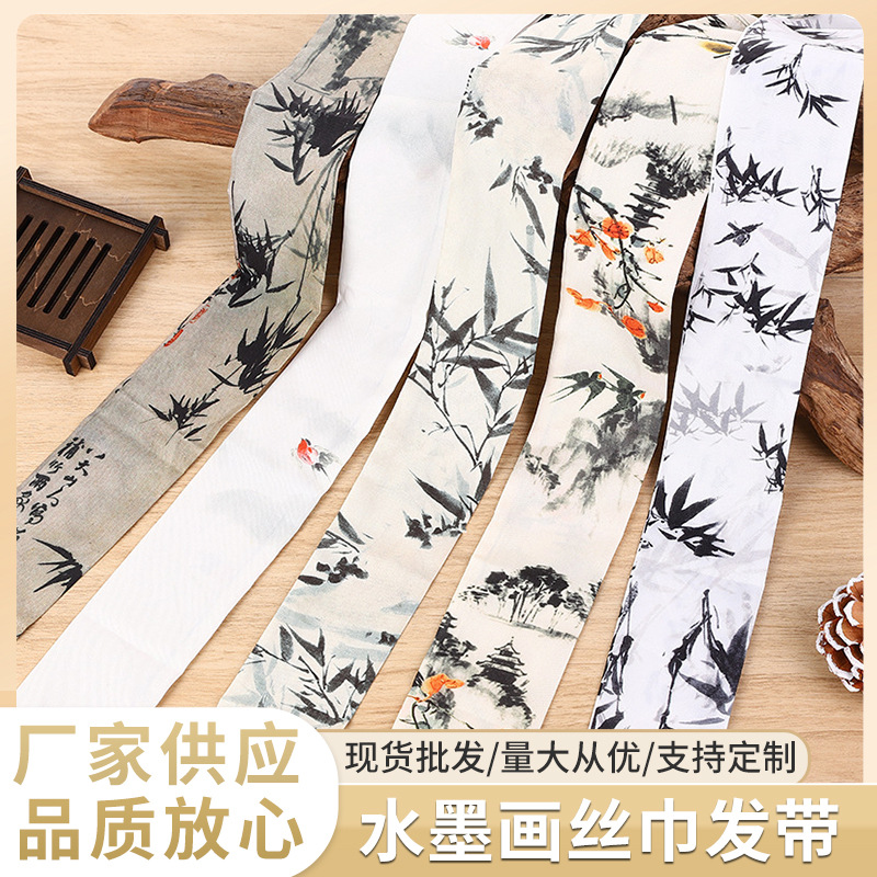 Ikat rambut gaya kuno Tiongkok baru syal sutra panjang aksesori rambut wanita lukisan tinta ikat rambut gaya Tiongkok