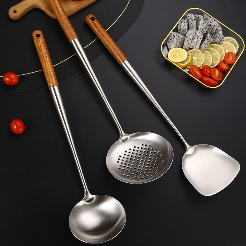 Spatula peralatan dapur baja tahan karat 304 setelan diperpanjang spatula gagang kayu sendok goreng memasak rumah tangga untuk koki