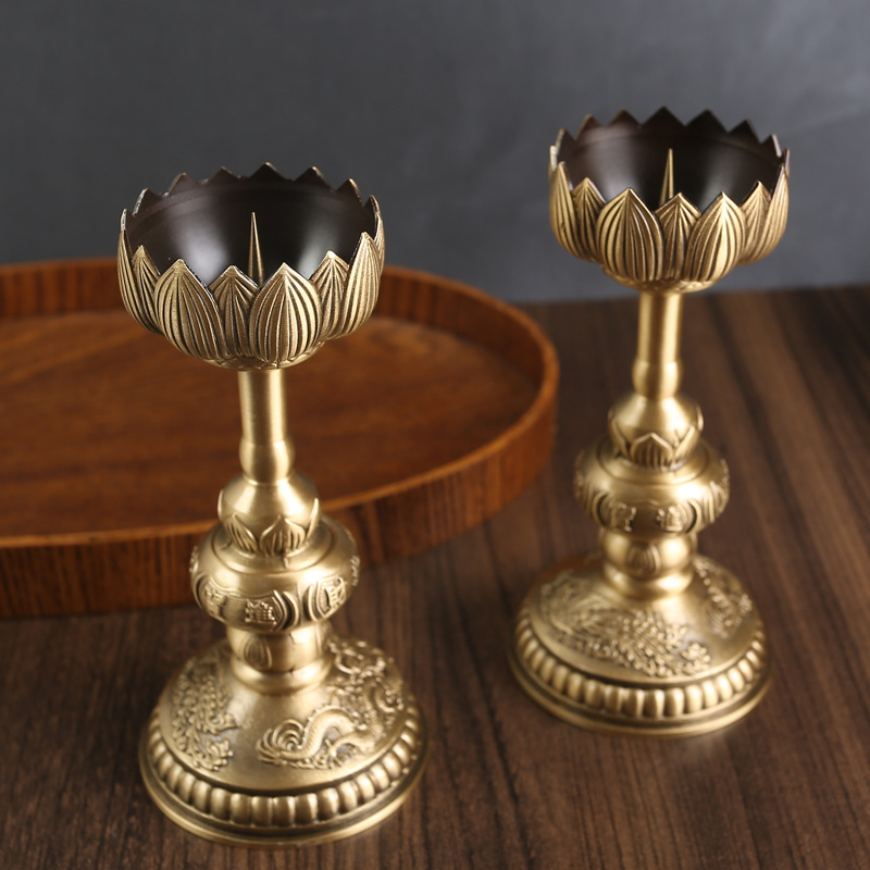 Dekorasi lilin kuningan dasar sepasang tempat lampu depan Buddha sembahyang Rumah Tangga Tempat lilin kaki tinggi grosir produk tembaga