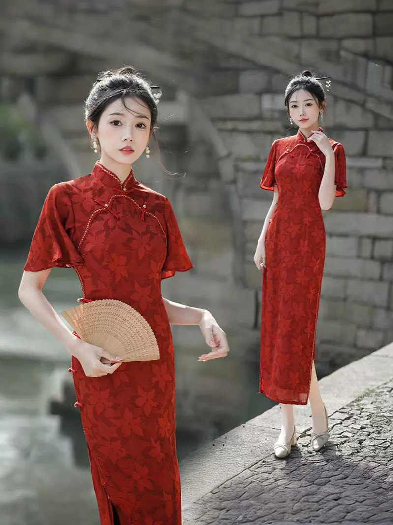 Musim panas embun musim semi dan musim panas 2024 baru ditingkatkan cheongsam muda harian ramping pinggang tinggi elegan gaun merah pakaian roti untuk wanita