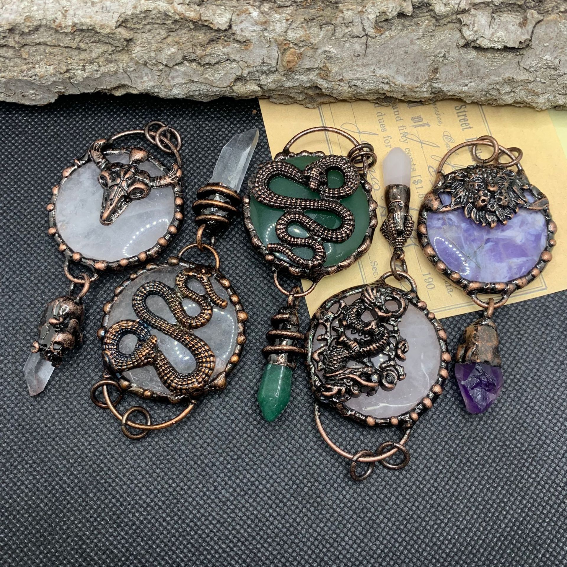 Liontin rantai sweter Eropa dan Amerika lintas batas gaya retro Dongling kristal kue bulat besar giok kristal merah muda amethyst tengkorak naga perunggu