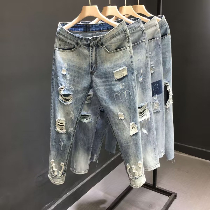 Jeans sobek untuk pria, celana Jin gaya Korea modis ramping berwarna terang musim panas 2023