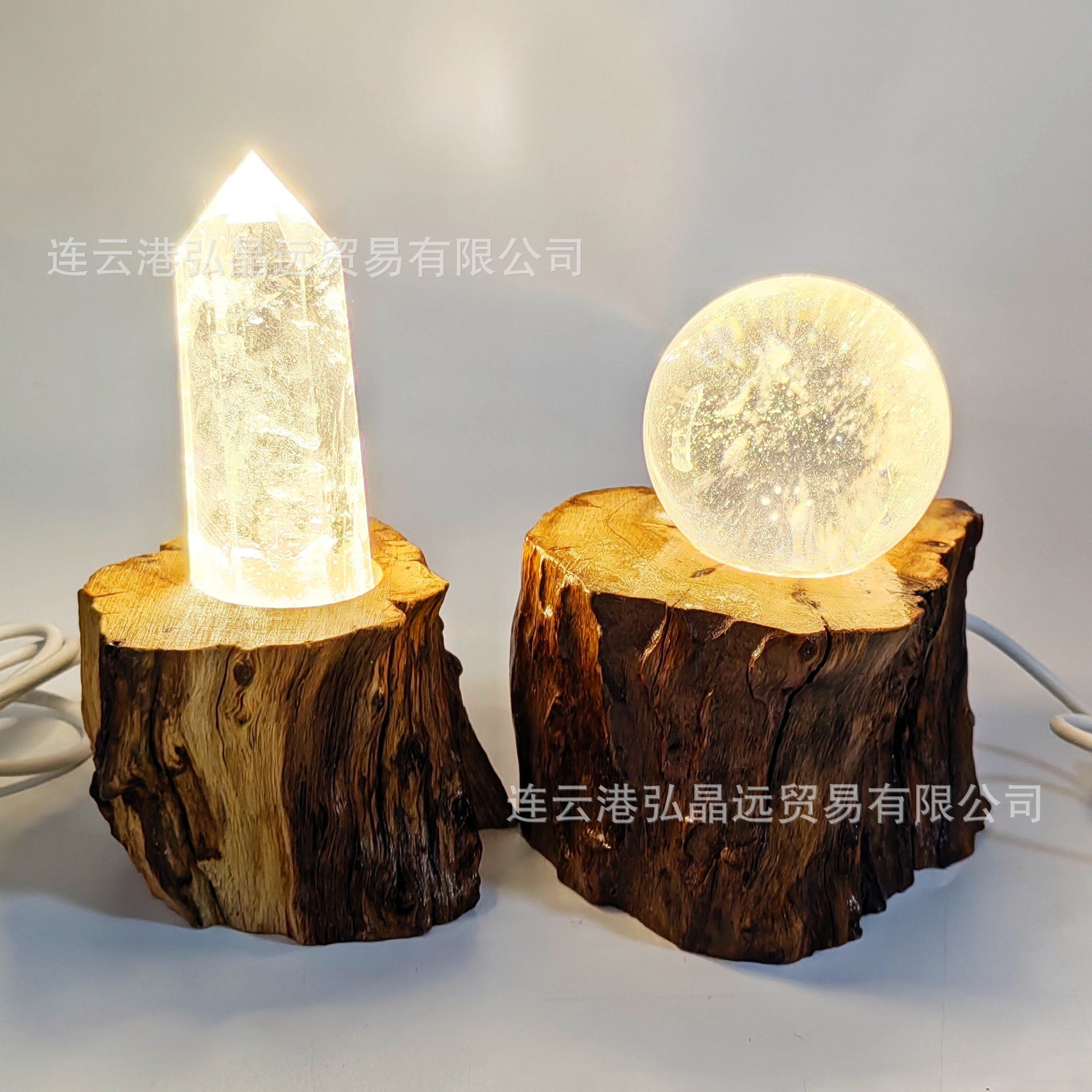 Alas lampu ukiran akar kayu solid alami, segmen kayu pohon, alas kolom kristal, alas bola, colokan USB, lampu tidur DIY