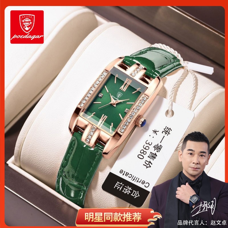 Swiss jam tangan wanita, sabuk merek Swiss jam tangan wanita ultra-tipis kotak hijau kecil siaran langsung perdagangan luar negeri populer pengiriman satu bagian