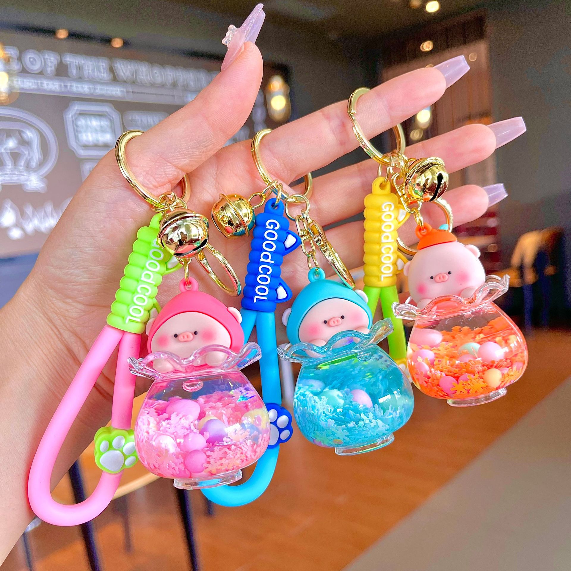 Gantungan Kunci botol pasir mengalir minyak lucu, gantungan kunci PVC epoxy boneka kartun rantai kunci