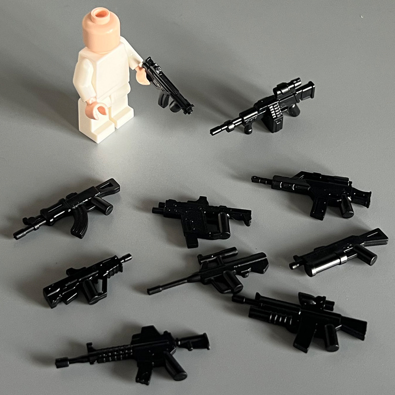 Blok bangunan partikel kecil memakai aksesoris alat genggam senjata pihak ketiga dilengkapi dengan 10 senapan