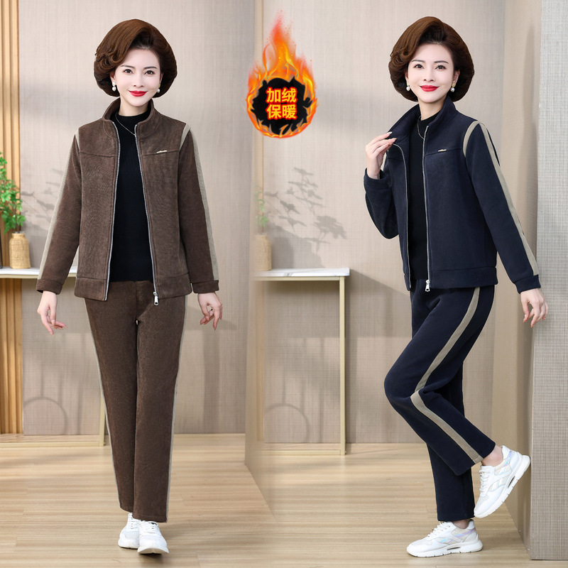 Pakaian ibu musim gugur dan musim dingin, dua set sweater berlapis bulu tebal, pakaian olahraga santai gaya Barat hangat