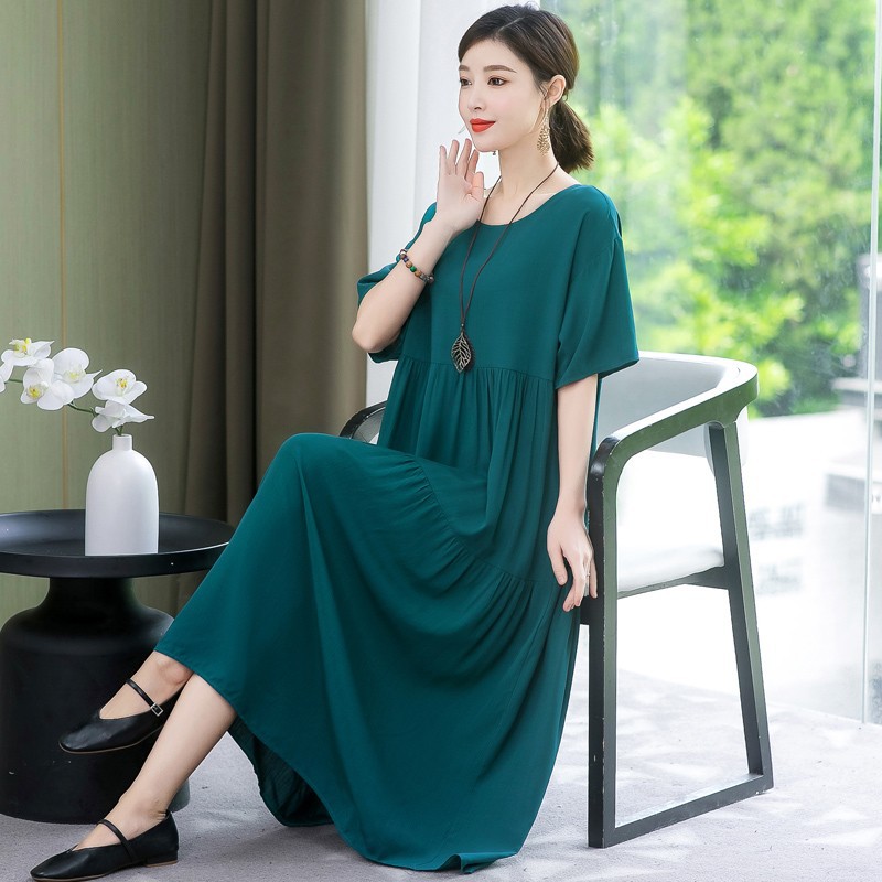 Gaun katun dan linen warna polos untuk wanita, gaya baru musim panas 2026, gaun elegan katun sutra untuk ibu, menutupi perut, melangsingkan, gaun panjang ukuran besar.