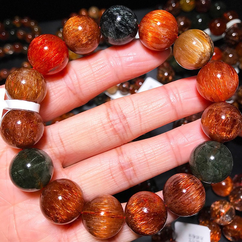 Rambut warna alami gelang kristal rambut hijau kristal Fu Lu Shou rambut tembaga merah kristal rambut halus mata kucing kristal cincin tunggal pria dan wanita gelang