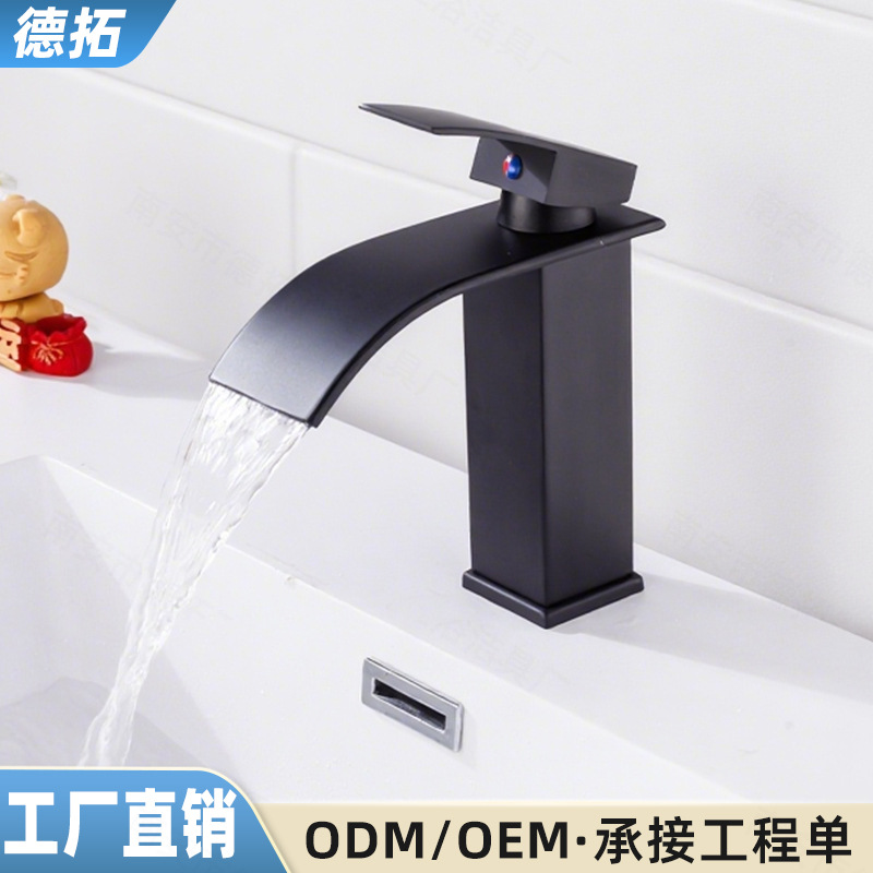 Keran wastafel hitam dari produsen untuk wastafel, keran air terjun tahan cipratan untuk kamar mandi, keran air panas dan dingin.