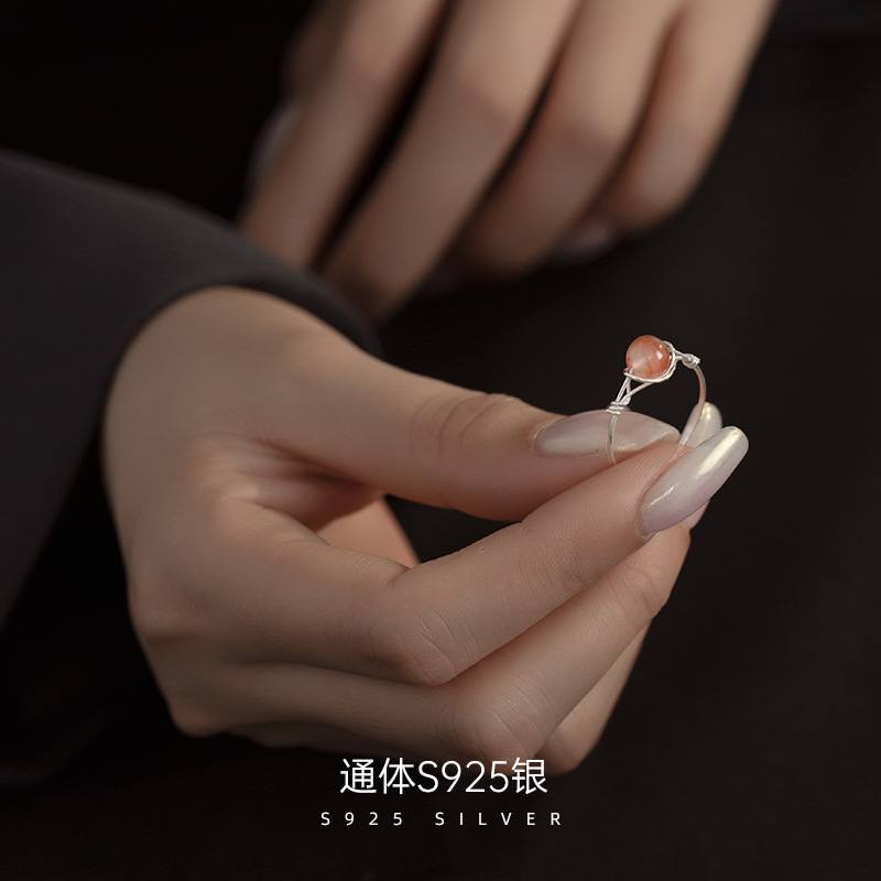 S925 cincin merah selatan kecil giok alami perak di bawah pohon banyan wanita buatan tangan lampu melingkar mewah menguntungkan cincin manik bulat generasi rambut