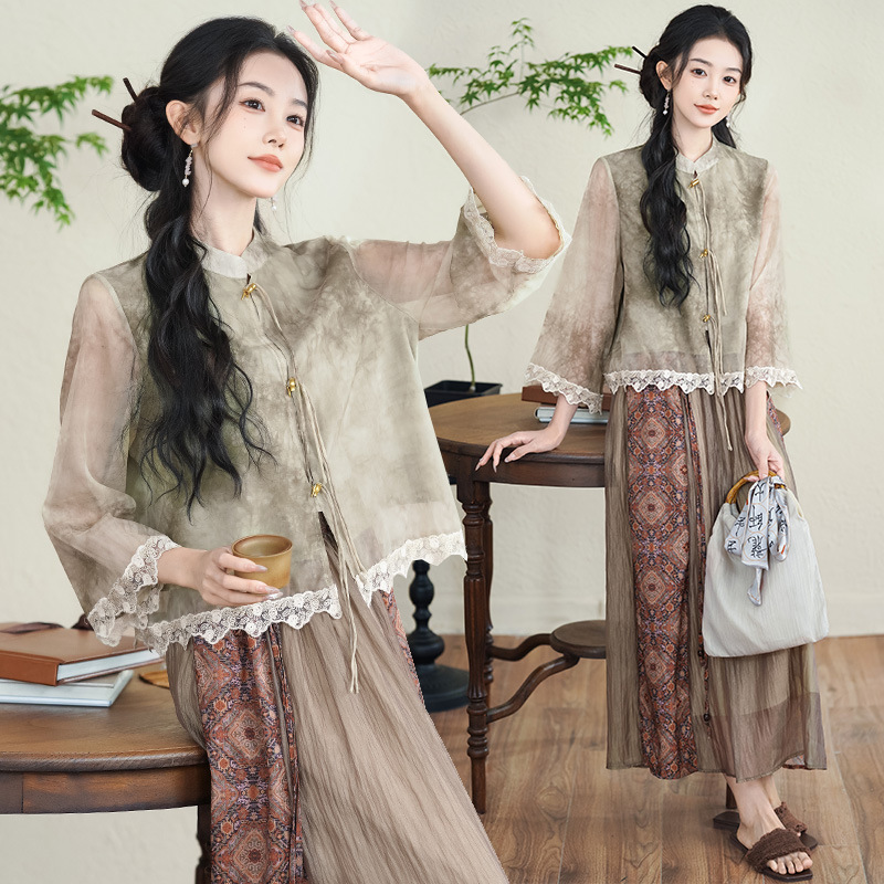 Real shot setelan Wanita Lengan renda, setelan wanita, atasan lengan renda, gesper Hanfu, retro, gaya Cina, baru
