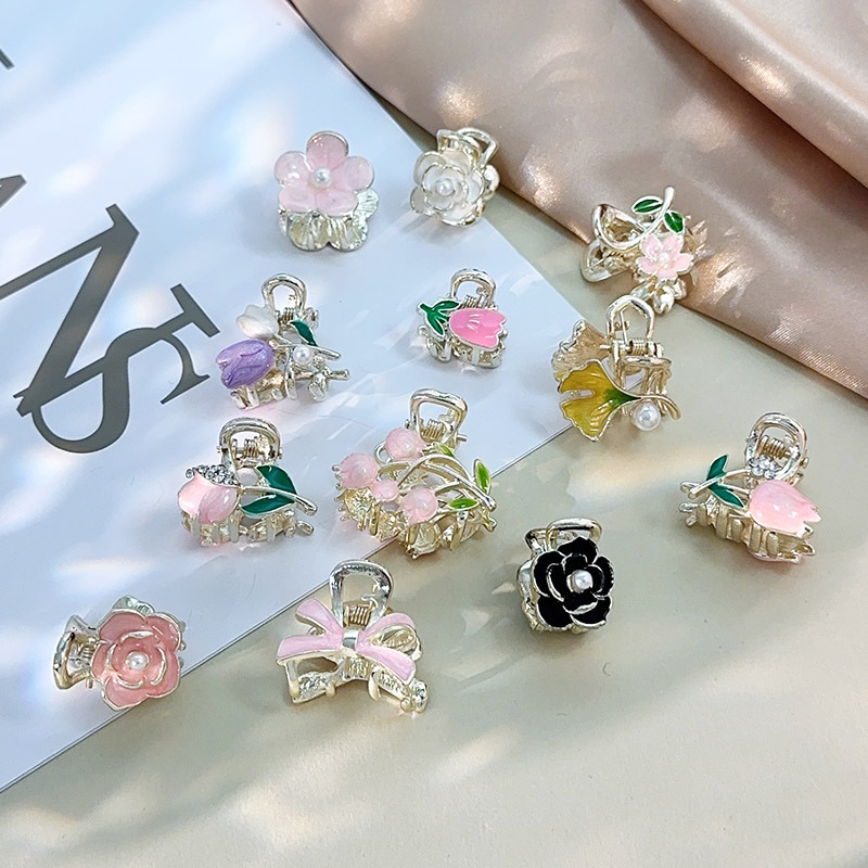 Klip Tulip Pink wanita, jepit rambut mawar ukuran kecil, poni samping, klip hiu kepala putri