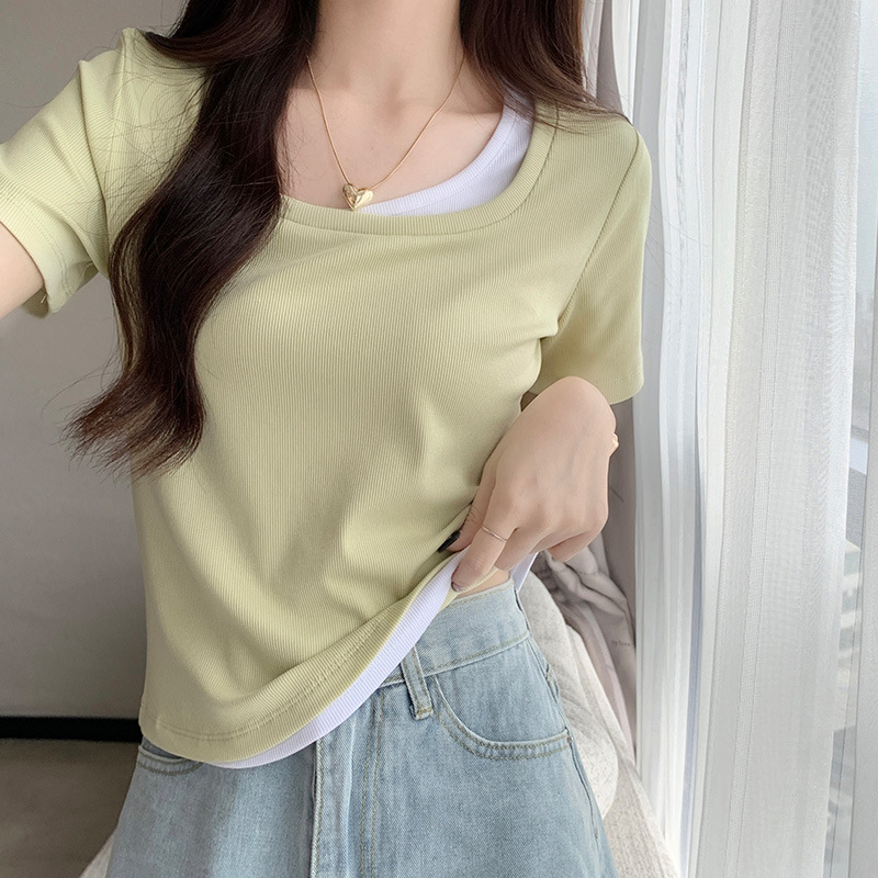 T-shirt Ramping Kerah Persegi Pendek Wanita Lengan Pendek 2025 Musim Panas Baru Palsu Dua Potong Disambung Bahu Kanan Atasan Katun Gaya Nafsu Murni