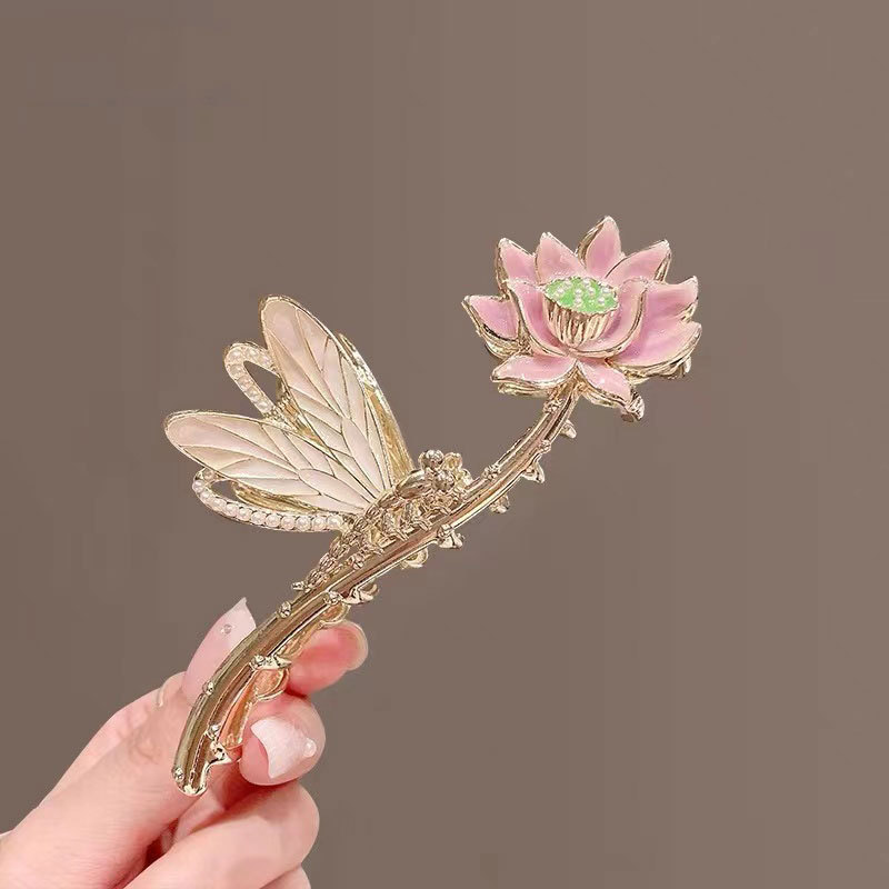 Capung Lotus teratai gaya retro capung baru Cina trendi Hanfu elegan besar ambil klip mutiara logam klip hiu