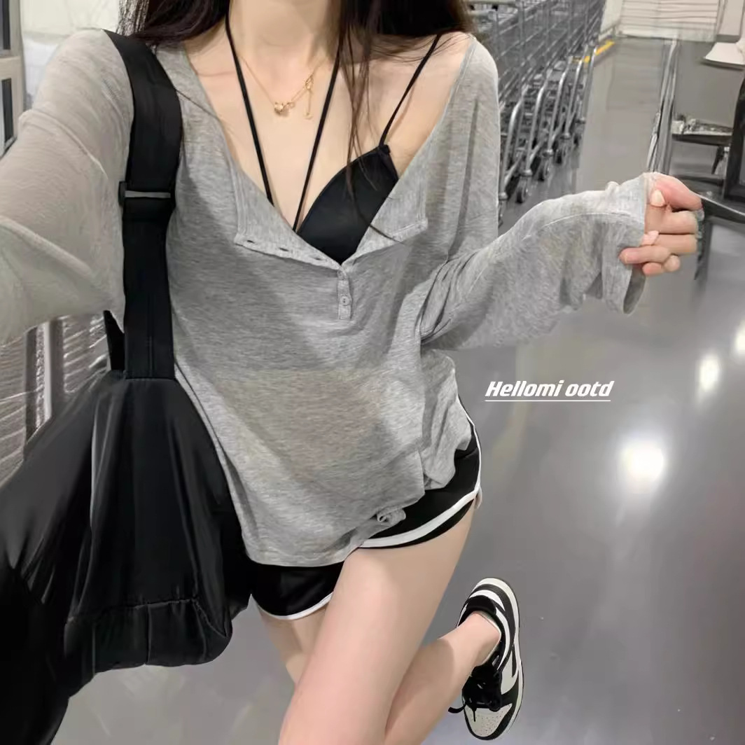 Kemeja lengan panjang longgar untuk wanita, kemeja dasar tipis atasan pelindung matahari abu-abu pelangsing leher V bergaya keinginan murni musim panas untuk wanita