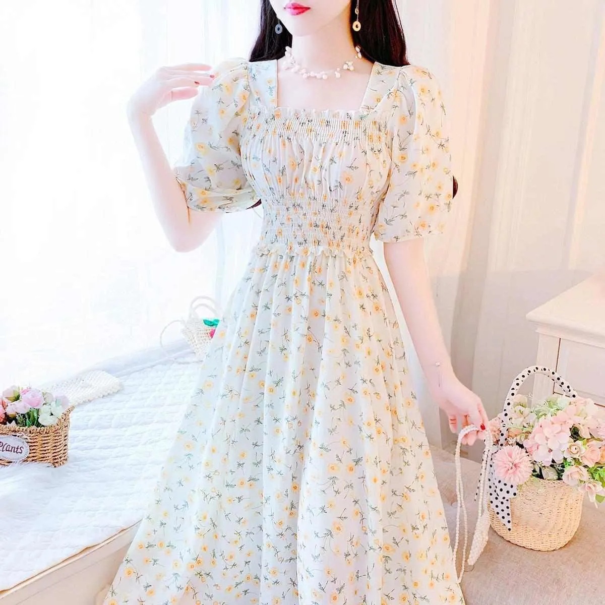 Gaun Perancis Istirahat Teh Ukuran Plus Ukuran Plus Rok Peri Baru Musim Panas Wanita Rok Panjang A-line Peri Super Kerah Persegi Gaya Inggris