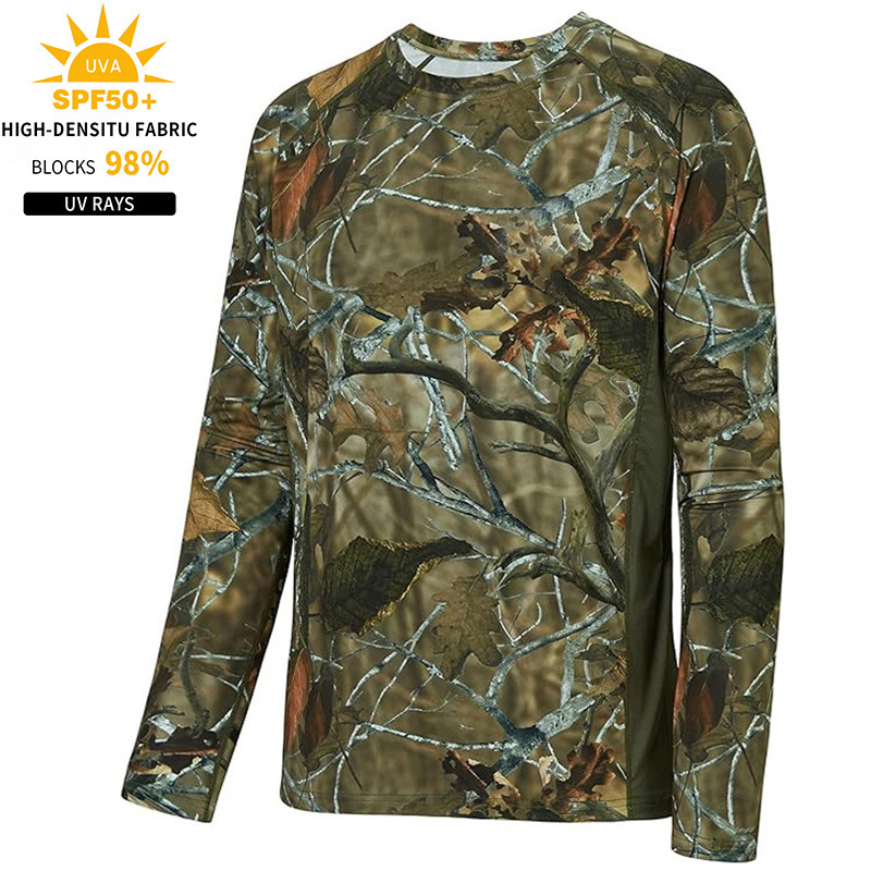 UFP50 kaus pelindung matahari lengan panjang, pakaian memancing sutra dingin lengan panjang leher bulat untuk olahraga luar ruangan berburu pelindung matahari