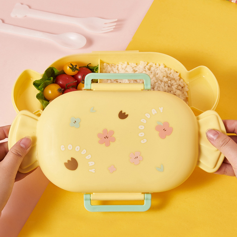 Kotak makan siang permen pemanas Microwave, kotak makan siang plastik dengan tutup portabel kompartemen siswa dengan sendok garpu